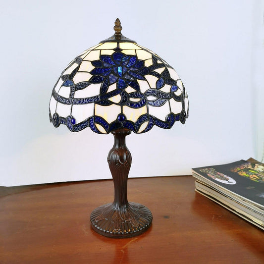 12in Mini Blue White Floral Design Stained Glass Tiffany Style Accent Table Lamp