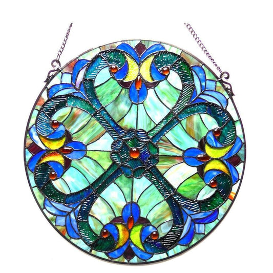 12-In Blue and Green Floral Tiffany Style Stained Glass Window Panel Suncatcher