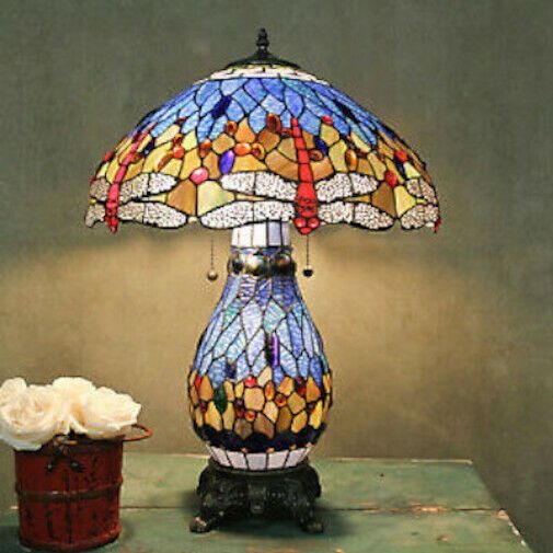 Tiffany Style Stained Glass Dragonfly Accent Reading Table Lamp w/ Lighted Base